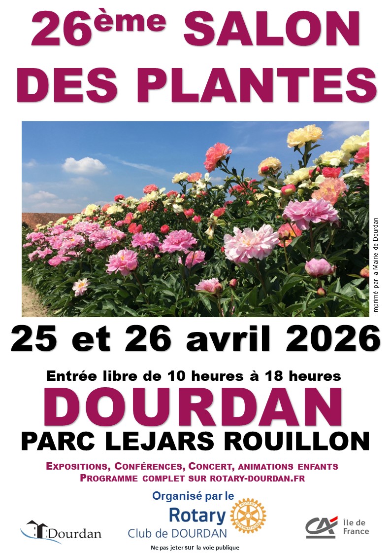 Le 26ème Salon des Plantes du Rotary Club de Dourdan aura lieu les 25 et 26 avril dans le Parc Lejars-Rouillon, tout près du château médiéval qui à lui seul mérite la visite de Dourdan. De nombreux exposants horticulteurs, pépiniéristes, décorateurs de jardins, maraicher et artisans, locaux pour la plupart, proposeront à la vente leurs productions variées.