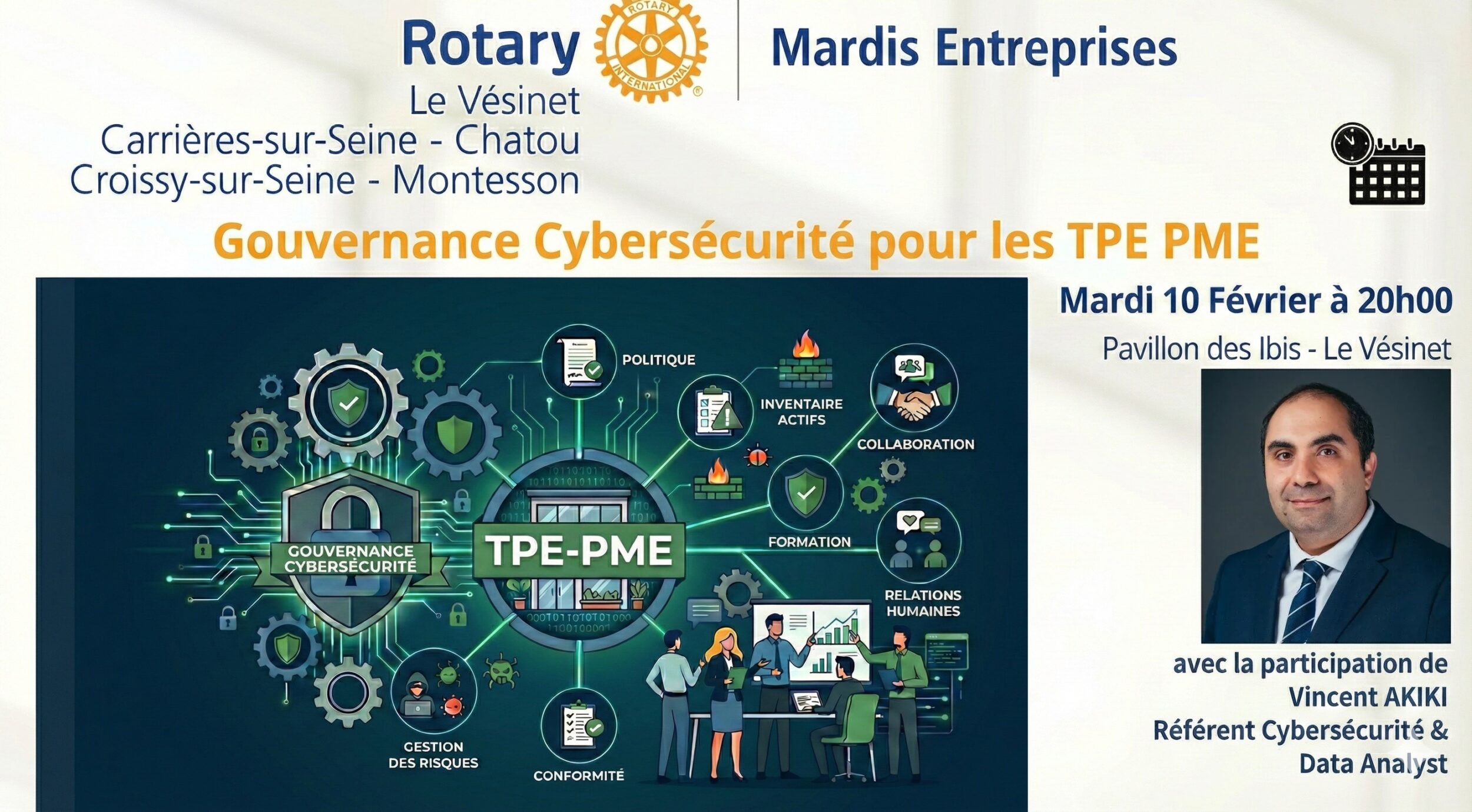 Dans le cadre de ses conférences/débats « Mardis Entreprises », le Rotary Club Le Vésinet a le plaisir de vous convier à la conférence qui se tiendra le 10 février prochain à 20h au Pavillon des Ibis au Vésinet, sur le thème de la gouvernance cybersécurité pour les TPE / PME.