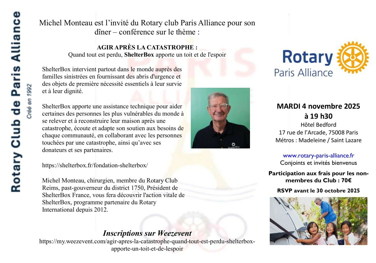 Le club Rotary Pais Alliance organise un dîner-conférence animé par Michel Monteau, président de shelterbox France, qui relatera comment les shelterbox sont un outil efficace dans les catastrophes de toute sorte.